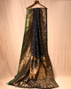 The intricate art of bandhani which originates from the western regions of India is a timeless classic. This wealthy blackish-green bandhani saree adds depth and the fusion of black and green symbolizes vitality, reflecting wearer's confidence. The symmetrical arrangement of the tie-dye patterns creates a visually striking effect, drawing attention to the exquisite details of the saree.