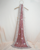 The diaphanous organza fabric in a soft blush pink hue creates a dreamy canvas for the artfully scattered floral embroidery. Each motif features delicate blooms in subtle blue and white threadwork, meticulously hand-embroidered by skilled artisans. The thoughtful placement of these floral elements creates a garden-inspired aesthetic that is both sophisticated and enchanting.
