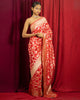 Embrace heritage with this Red Pure Silk Paithani Saree, featuring a single muinya border on one side and a big lotus and peacock weave on the other. This saree is an heirloom piece, perfect for celebrating Karwa Chauth’s timeless traditions.